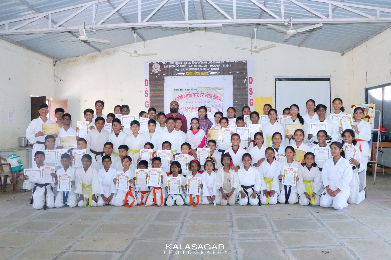 मोहोळचे ग्रामदैवत सद्गुरु नागनाथ महाराज देशभक्त संभाजीराव गरड महाविद्यालयाचे संस्थापक डॉक्टर वसंतराव गरड कराटे प्रशिक्षक, योगाचार्य सुरेश जाधव यांच्या प्रतिमेचे पूजन करून कार्यक्रमाची सुरुवात करण्यात आली, अकॅडमीचे खेळाडू जिल्हास्तरीय, राज्यस्तरीय, राष्ट्रीय स्तरावर व खेलो इंडिया सारख्या नामांकित स्पर्धेपर्यंत पोहोचून त्या ठिकाणी यश संपादन करत आहेत. अकॅडमी आज चार वर्षाची यशस्वी कारकीर्द पूर्ण करून पाचव्या वर्षामध्ये पदार्पण करत आहे, अकॅडमीच्या खेळाडूंनी वर्षभरामध्ये ज्या स्पर्धा जिंकलेल्या असतात, कराटे बेल्ट परीक्षेमध्ये प्राविण्य मिळवलेले असते अशा खेळाडूंना प्रमाणपत्राचे वितरण मान्यवरांच्या हस्ते करण्यात आले यावेळी शिवसेना जिल्हाप्रमुख चरणराज चवरे, मोहोळच्या नगराध्यक्ष सिद्धीताई वस्त्रे, ऍड. ऐश्वर्या बारसकर, माझी मुख्याध्यापक पांडुरंग सोलंकर, अकॅडमी चे पालक सचिन शास्त्री यांनी विद्यार्थ्यांना मार्गदर्शन करून पुढील वाटचालीस शुभेच्छा दिल्या. यावेळी धाराशिव सहकारी साखर कारखान्याचे संचालक रणजीत भोसले, जगदंबा विद्यालयाचे माजी मुख्याध्यापक श्रीधर उन्हाळे, दाईंगडेवाडी वाडीचे पोलीस पाटील अमोल काळे, अकॅडमी चे पालक निर्मलाताई पांढरे, लक्ष्मण वाघमोडे, सुहास शिंदे, नितीन बारसकर, पत्रकार बांधव व अकॅडमीचे पालक मोठ्या संख्येने उपस्थित होते. कार्यक्रमाचे प्रास्ताविक अकॅडमीचे संस्थापक दशरथ काळे यांनी केले. सूत्रसंचलन श्रावणी दळवे हिने तर संस्कृती गायकवाड हिने आभार व्यक्त केले.