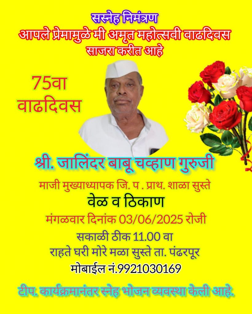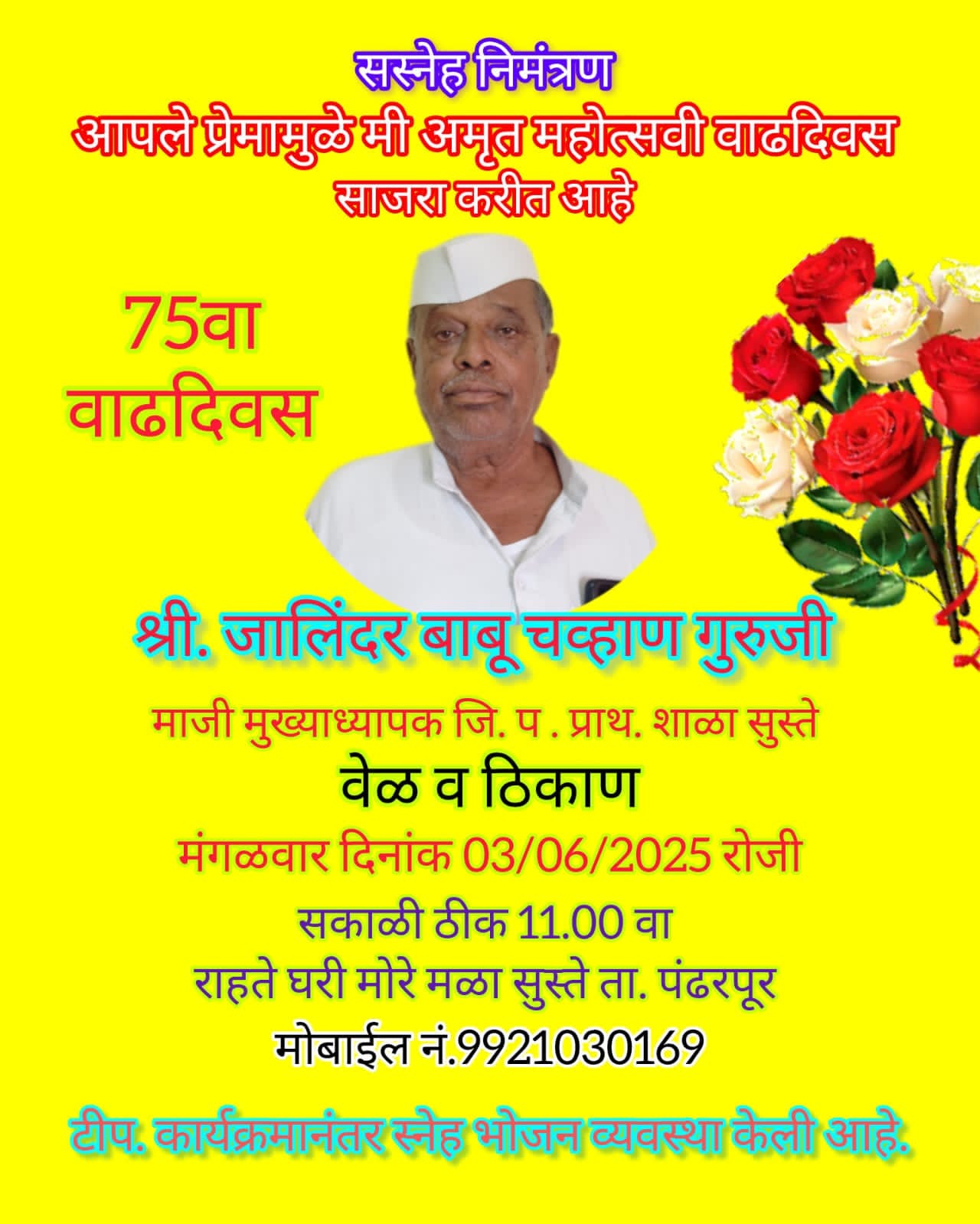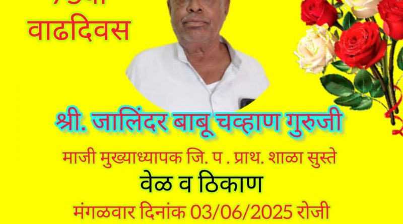 आरोग्य श्री जालिंदर बाबु चव्हाण गुरुजी यांचा 75वा अमृत महोत्सव वाढदिवस admin June 3, 2025June 3, 2025 0 Comments श्री जालिंदर बाबु चव्हाण गुरुजी यांचा 75वा अमृत महोत्सव वाढदिवस Spread the love