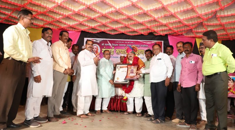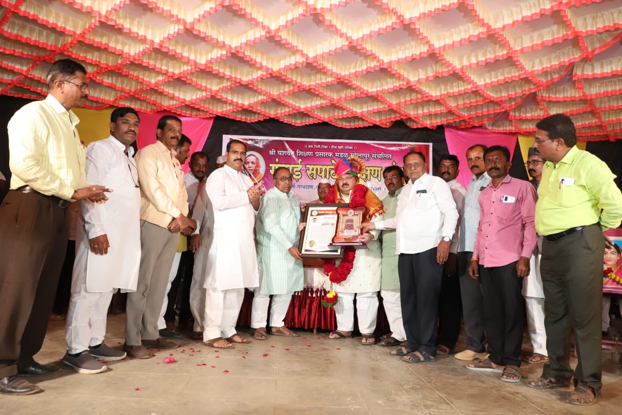 तारापूर : मोहोळचे विद्यमान आमदार राजाभाऊ खरेसाहेब यांना मराठा समाज सेवा मंडळ सोलापूर संस्थेच्या वतीने शिवतीर्थ समाज भूषण पुरस्कार देऊन सन्मान करण्यात आला.आमदार राजाभाऊ खरेसाहेब यांचे मोहोळ मतदार संघातील सामाजिक शैक्षणिक व इतर समाज उपयोगी कामे लक्षात घेऊन मराठा समाज सेवा मंडळाचे अध्यक्ष मनोहरजी सपाटेसाहेब यांच्या हस्ते या पुरस्काराचे वितरण करण्यात आले.तारापूर येथील गंगाई सपाटे शिक्षण संकुलात हा कार्यक्रम आयोजित करण्यात आला होता.यावेळी राजाभाऊ खरे यांचा सन्मानपत्र, पदक,शाल,पुष्पगुच्छ देऊन सन्मान करण्यात आला.