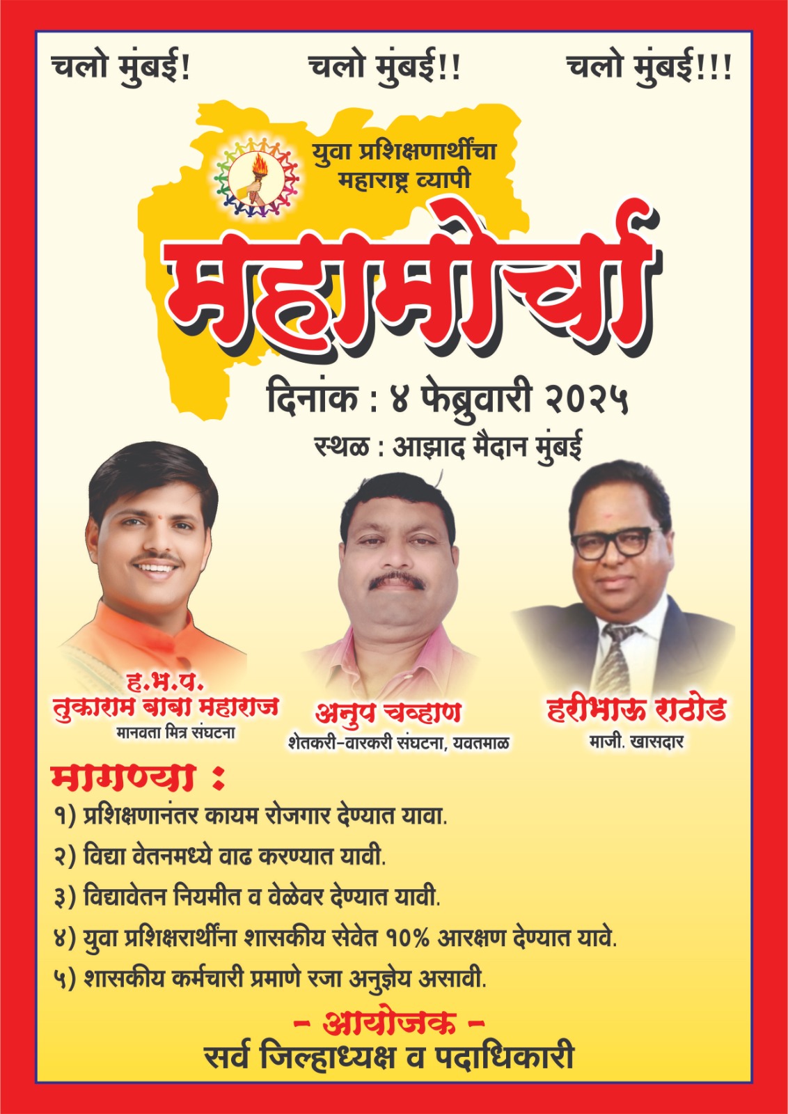 राज्यातील युवा प्रशिक्षणार्थीच्या मागण्यासाठी मुंबईत आज आझाद मैदानावर महामोर्चा★ हभप तुकाराम बाबा उतरणार महामोर्चात; पश्चिम महाराष्ट्राचे स्विकारले नेतृत्व★ जिल्हाधिकारी राजा दयानिधी यांना दिले निवेदन