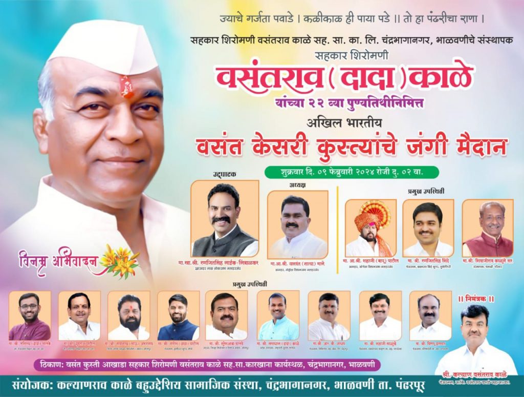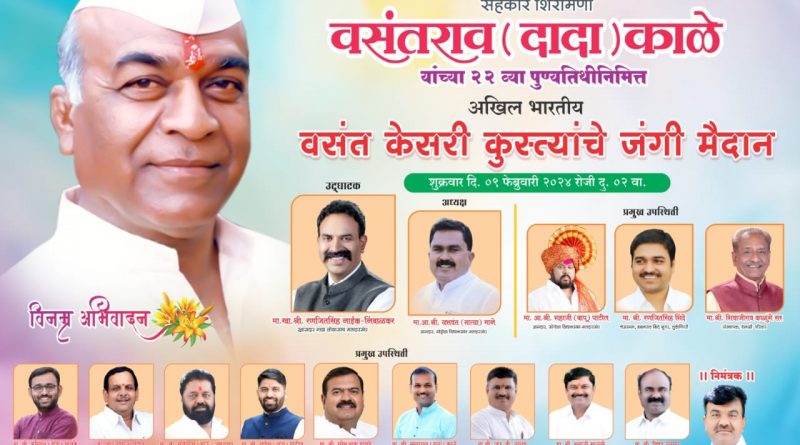 शेती विषयी वसंतदादा काळे यांच्या 22व्या पुण्यतिथी निमित्त अखिल भारतीय वसंत केसरी कुस्त्यांचे जंगी मैदान, दिनांक 9 फेब्रुवारी 2024 रोजी, दुपारी 2 वाजता admin February 8, 2024March 15, 2024 0 Comments वसंत केसरी कुस्त्यांचे जंगी मैदान 2024 Spread the love वसंत केसरी कुस्त्यांचे जंगी मैदान 2024